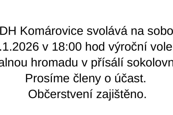Zjistit víceV sobotu 11.10.2025 pořádá SDH Komárovice tradiční posvícenskou zábavu. Bude i vyhrávka po obci v 15:00 hodin. Hraje Horňanka. Začátek ve 20:00 hodin.